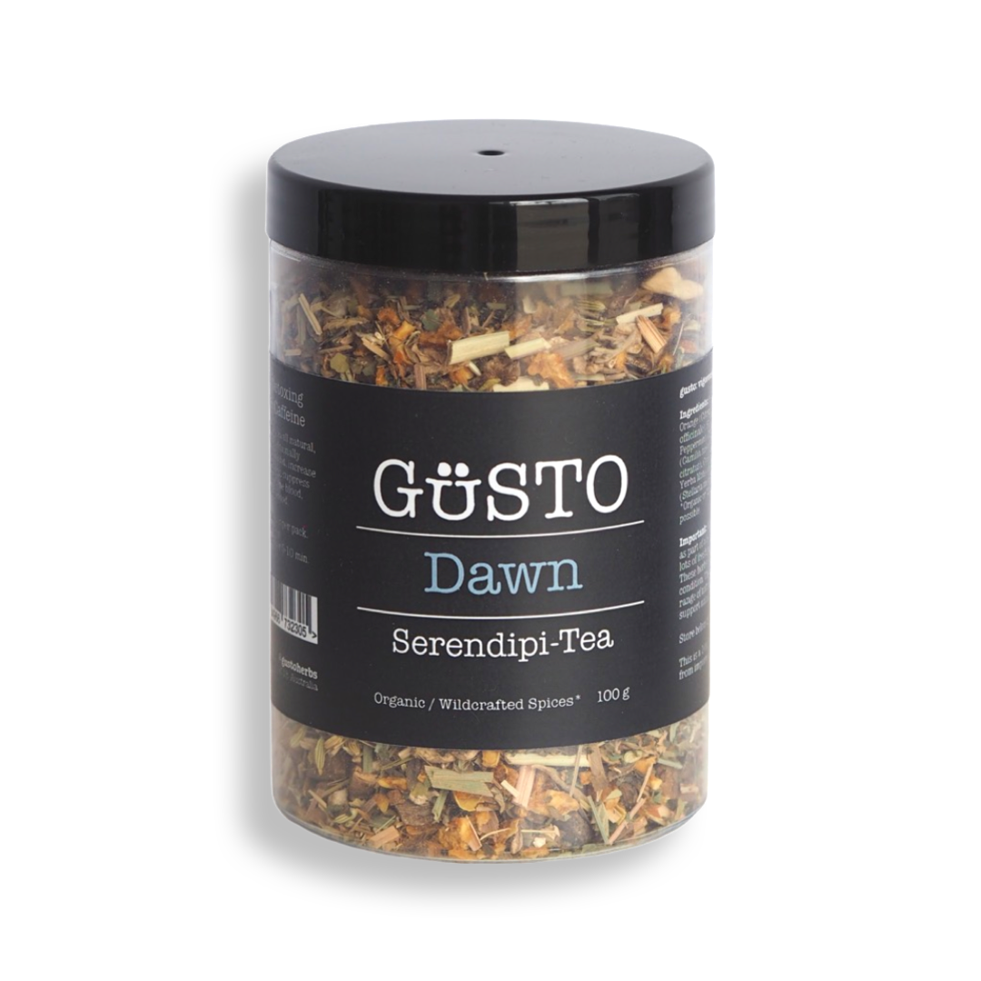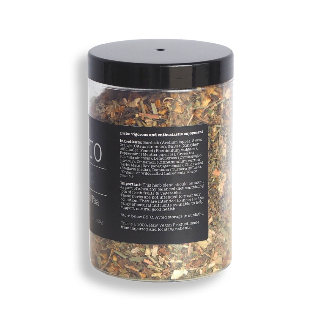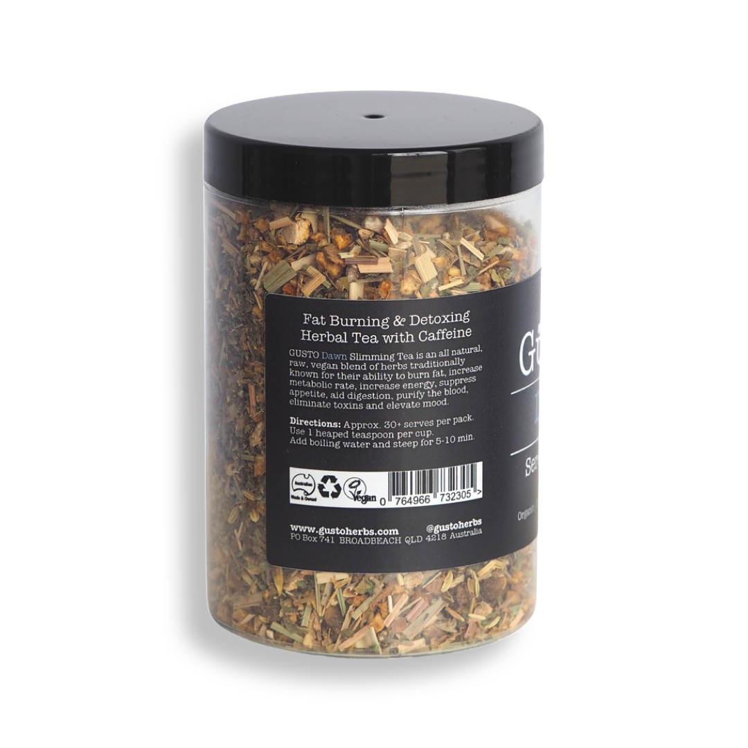 GUSTO Dawn Serendipi-Tea is an all natural, raw, vegan blend of herbs traditionally known for their ability to burn fat, increase metabolic rate, increase energy, suppress appetite, aid digestion, purify the blood, eliminate toxins and elevate mood.