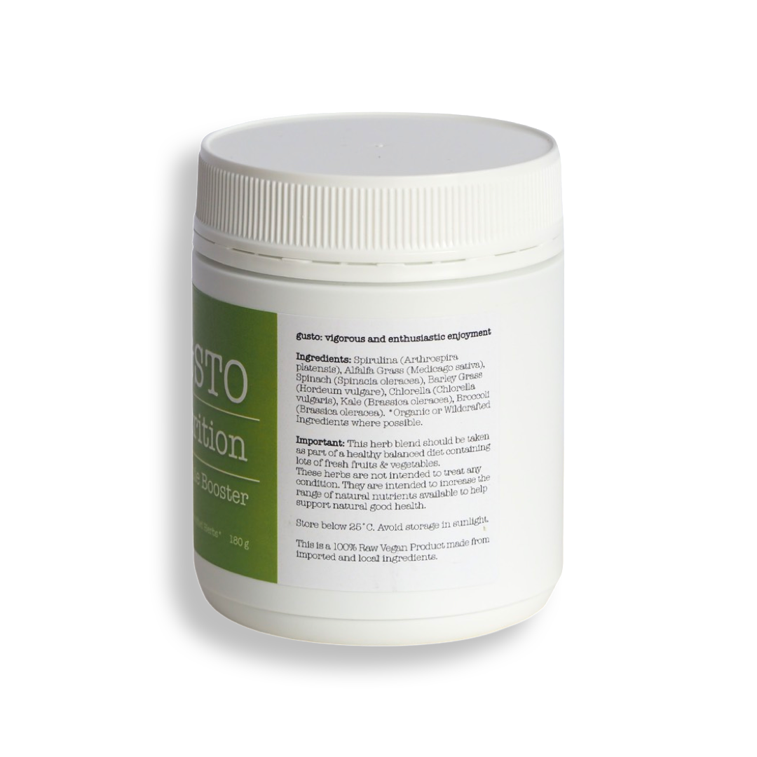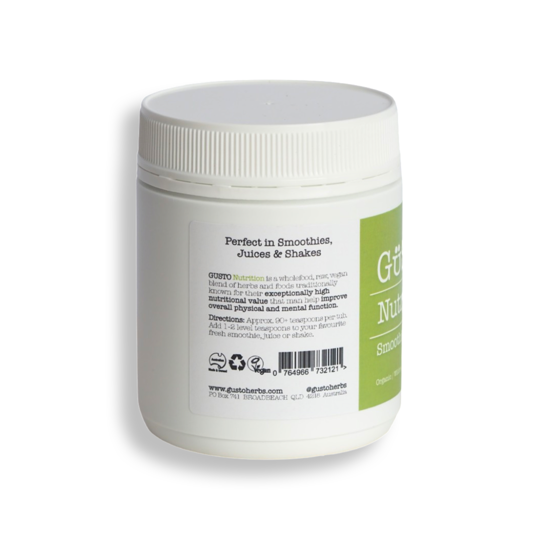 GUSTO Nutrition Smoothie Booster is a wholefood, raw, vegan blend of herbs and foods traditionally known for their exceptionally high nutritional value which can help to improve overall physical and mental function.